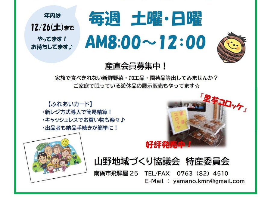 営業日時は、毎週「土曜・日曜」の「AM8:00~12:00」で、12月26日(土)まで営業する予定です。